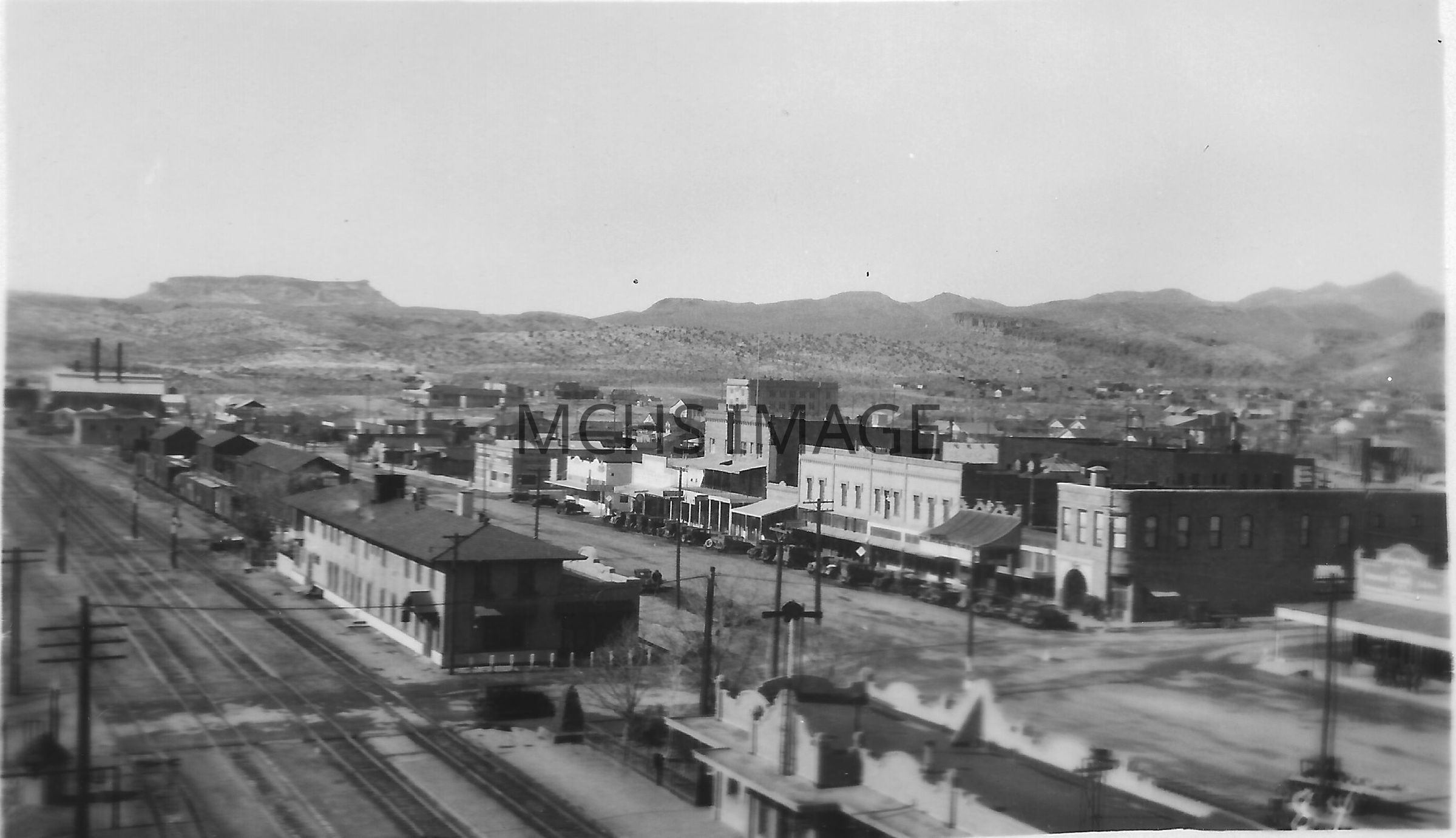 Andy Devine (Front Street), Harvey House at left, center of pic. Ca. 1929