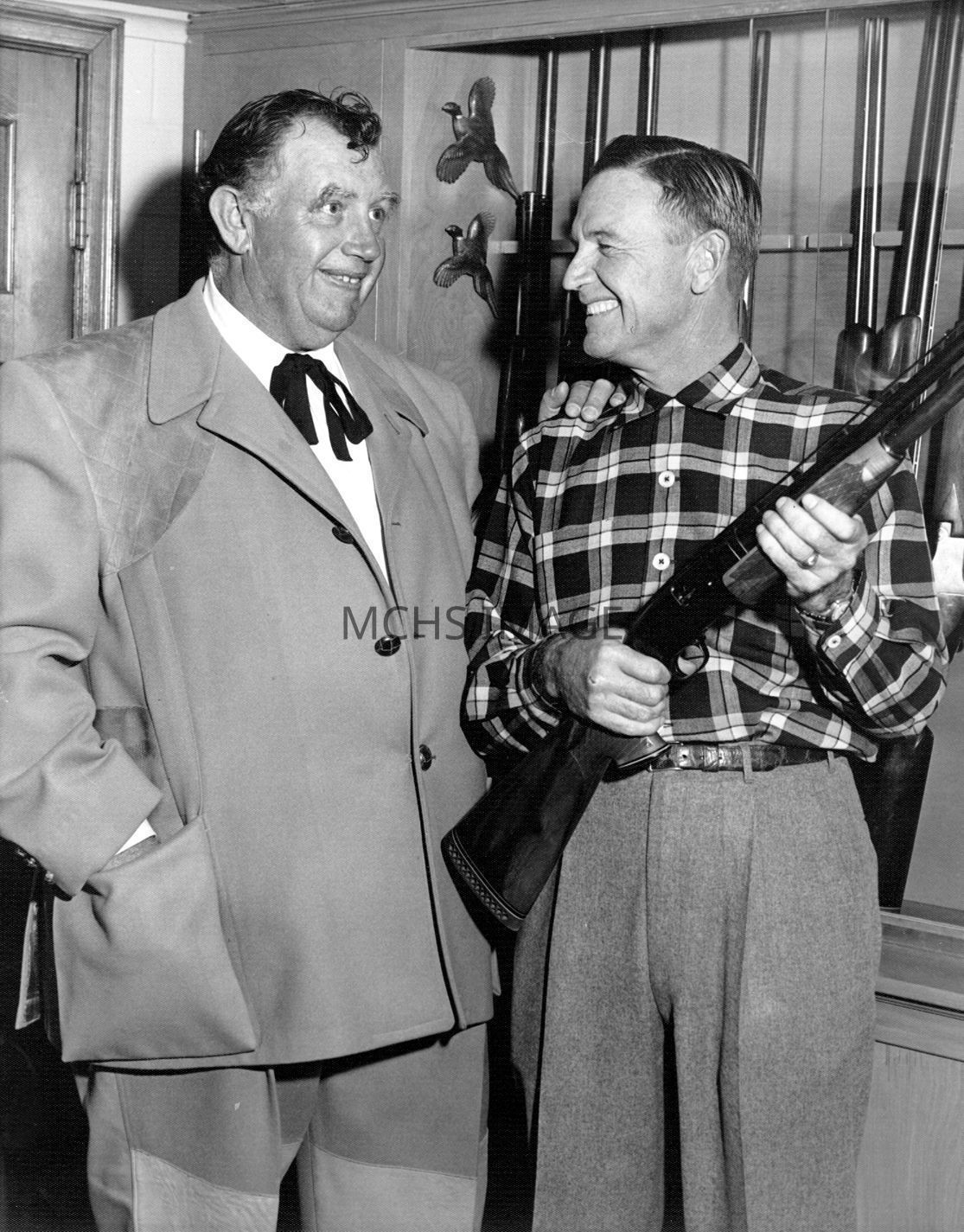 Andy Devine standing with Bill Harder holding a gun