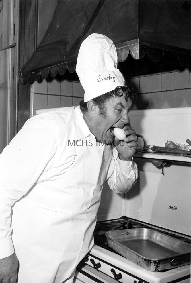 Andy Devine in a chef's suit and eating an egg