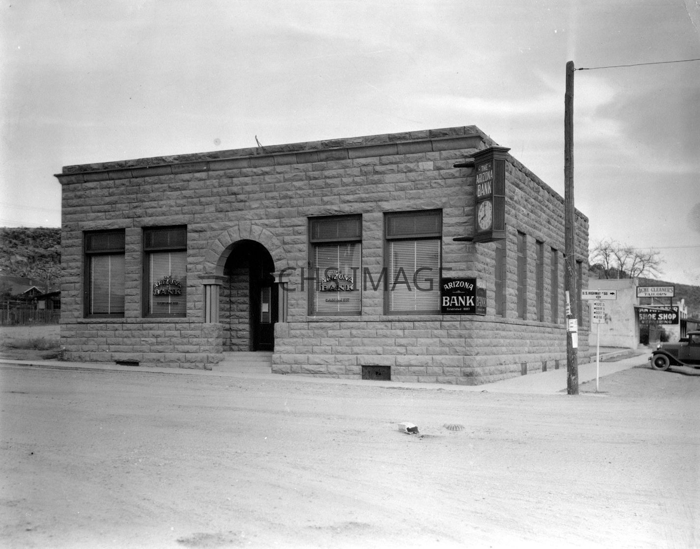 View of front of bank with an attractive arched entranceway. The clock reads 8:00. There are no buildings in the immediate area. NE corner of 4th and BealeCollection