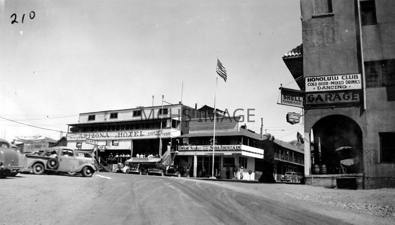 Oatman in 1933, showing Arizona Hotel, and Walsh Building to the right. Highway 66 is in foreground.Collection