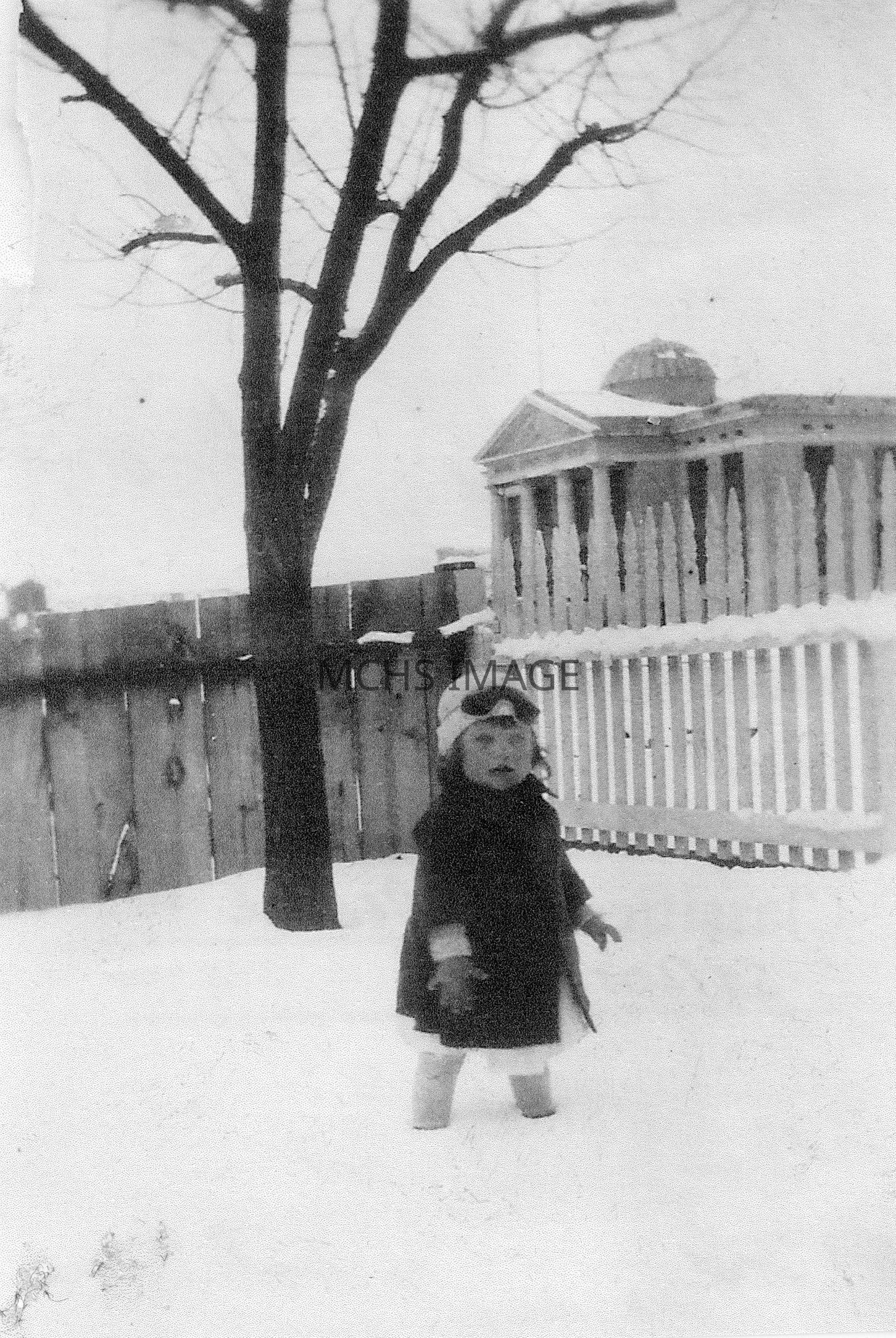 Arlie Mae Stromer, daughter of Ben and Florence Stromer who lived in Kingman from 1920-1934. Mohave County Courthouse in background.Collection