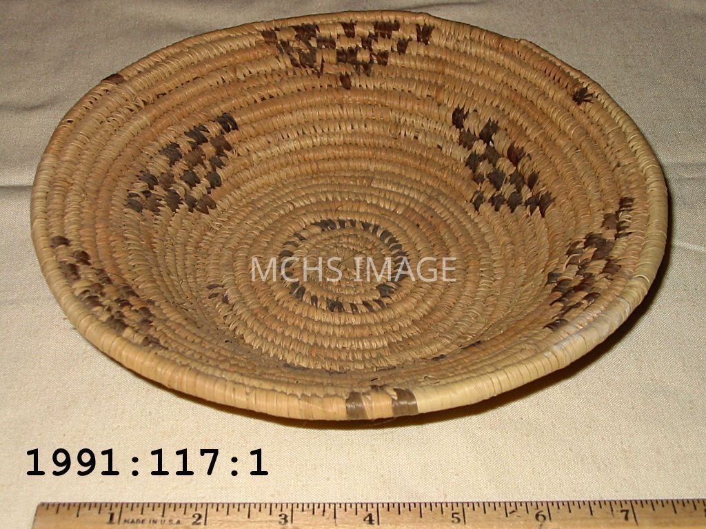 Basket has 23 coils, is 8" diameter, 1 -1/2" deep, in excellent condition, tan fiber with dark design called "Milky Way" or "Sky Mountains" - as identified by BLM Archeologist, Boma Johnson. Hualapai Native American made.