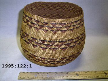 Basket is 5 -7/8" tall x 24" circumference, made by Hualapai Indians, in excellent condition, twined weave, cut off warp elements at the rim, which is typical of Northern California baskets, weave is of tan grass or plant fiber with black and brown designs, three rows of brown triangles make up pattern.