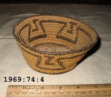 Basket is 2 -1/2" high, 5 -1/4" diameter top, 3 - 3/4" base, in excellent condition, design motif is in black devils claw. Pima Purchased in Phoenix.