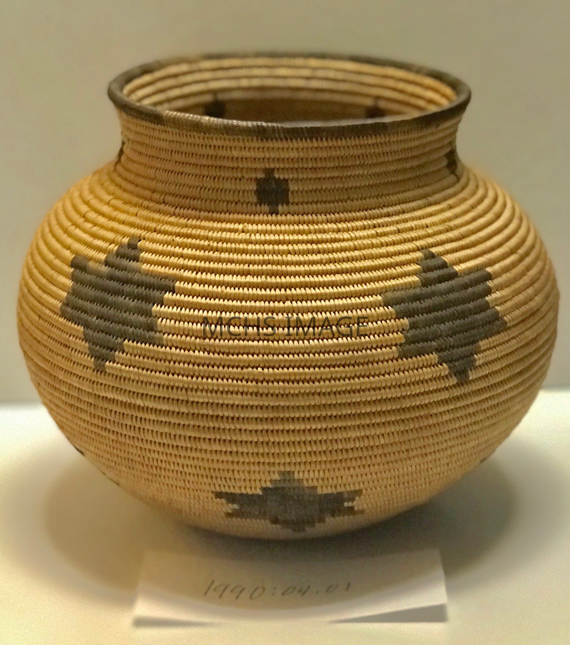 Basket is 6 -1/2" tall x 5 -1/4" diameter at mouth, in excellent condition, finely woven, ecru colored with dark designs, 10, 6 point stars around large part, 5 smaller designs just under lip.