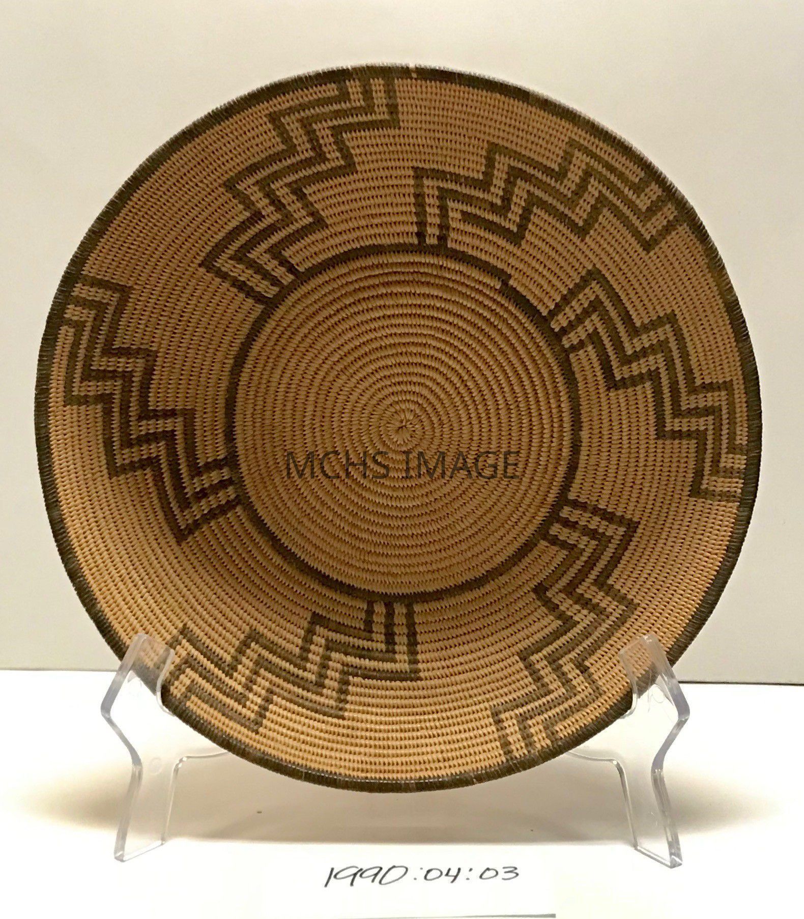 Basket is 11" diameter at lip x 3 - 3/4" depth, finely woven, ecru color with dark designs, shallow bowl, round, triple stair pattern from rim to bottom, repeated around basket Chemeuvi