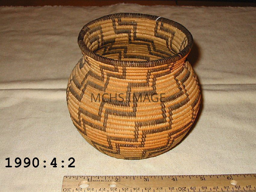 Made in 1914, by Mojave Indian, purchased by L.H. Foster, in memory of L.H. Foster (Marjorie Wheeler's father). Basket is 4 1/2" tall x 4 1/8" deep at lip, in excellent condition, finely woven, ecru color with dark designs, double stair-step pattern repeated all around from lip to bottom. Chemuevi Native American made.