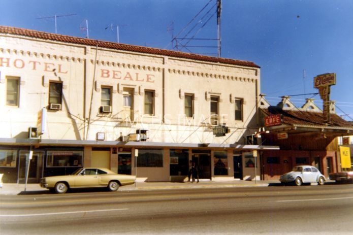 Beale Hotel with El Camino Nite Club on right. The building has a decorative roof, 2 cars in front. Andy Devine St.Collection