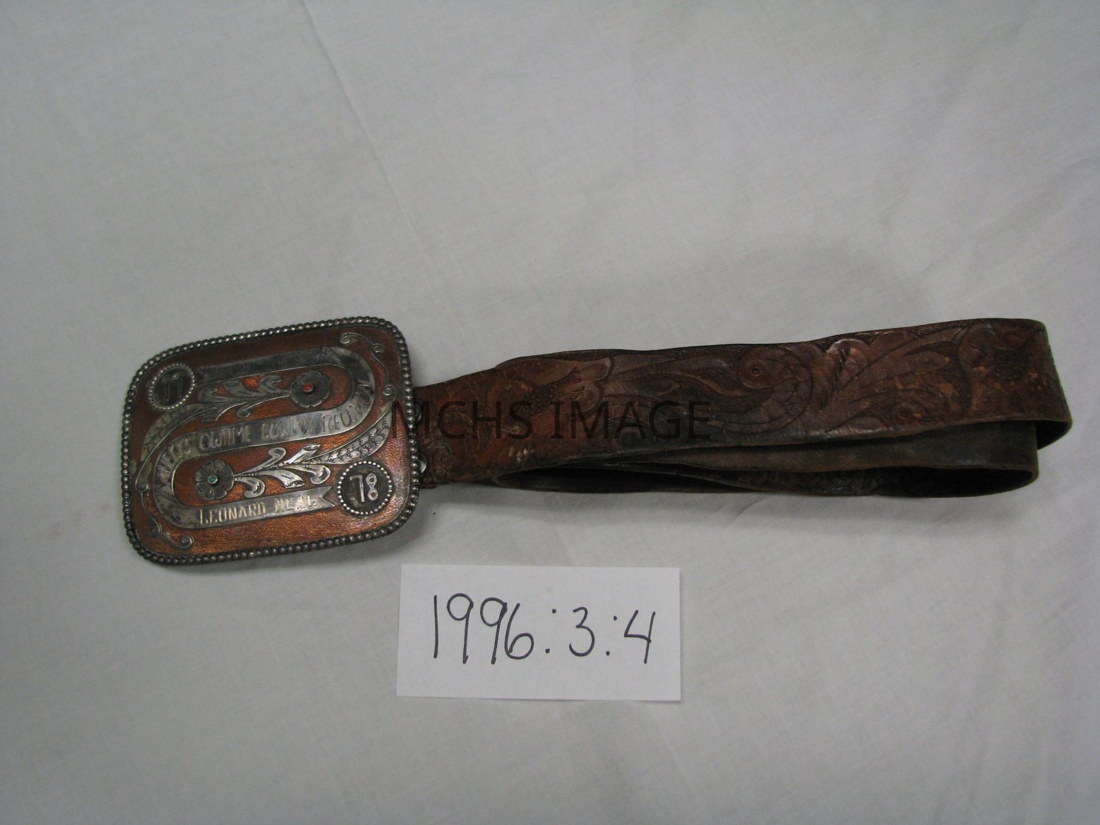 Belt and buckle, copper base with silver beaded edge and silver inlaid design, a banner with words "Calf Roping - Avery's Oldtime Cowboy Reunion - Leonard Neal 1978. 2 eight petal flowers have centers, one of turquoise & one of coral. Belt is hand tooled leather which includes Diamond Bar brand on the back. Back of buckle has the initials etched into the copper " BCMc-"