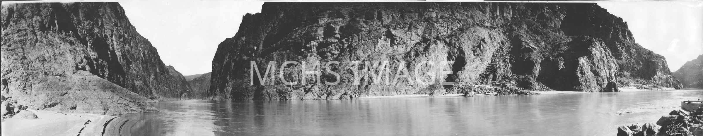 Panoramic photo of future site of Hoover/Boulder Dam on the Colorado River at Black Canyon. Photograph is by N. E. Johnson who was based in Los Angeles, California. Local entrepeneur Al Jagerson, who had traversed the Black Canyon waterway often in the 1920's and probably was guide and transportation for the photographer, also contracted to transport drilling crews by boat to the Dam Site during construction in the early 1930's.Other Names and Numbers