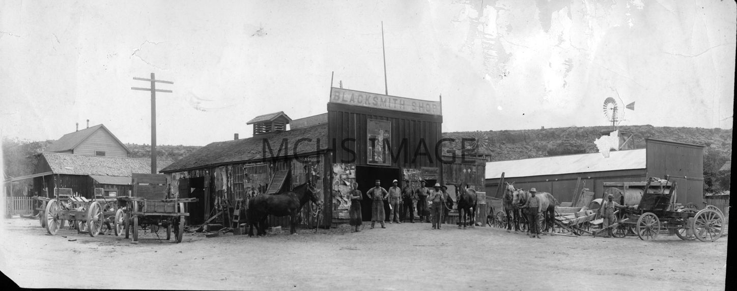 Entrance faces south; 3 wagons, horses, and many people standing about. There is a windmill in the distance. 4th and Beale Streets, NE cornerCollection