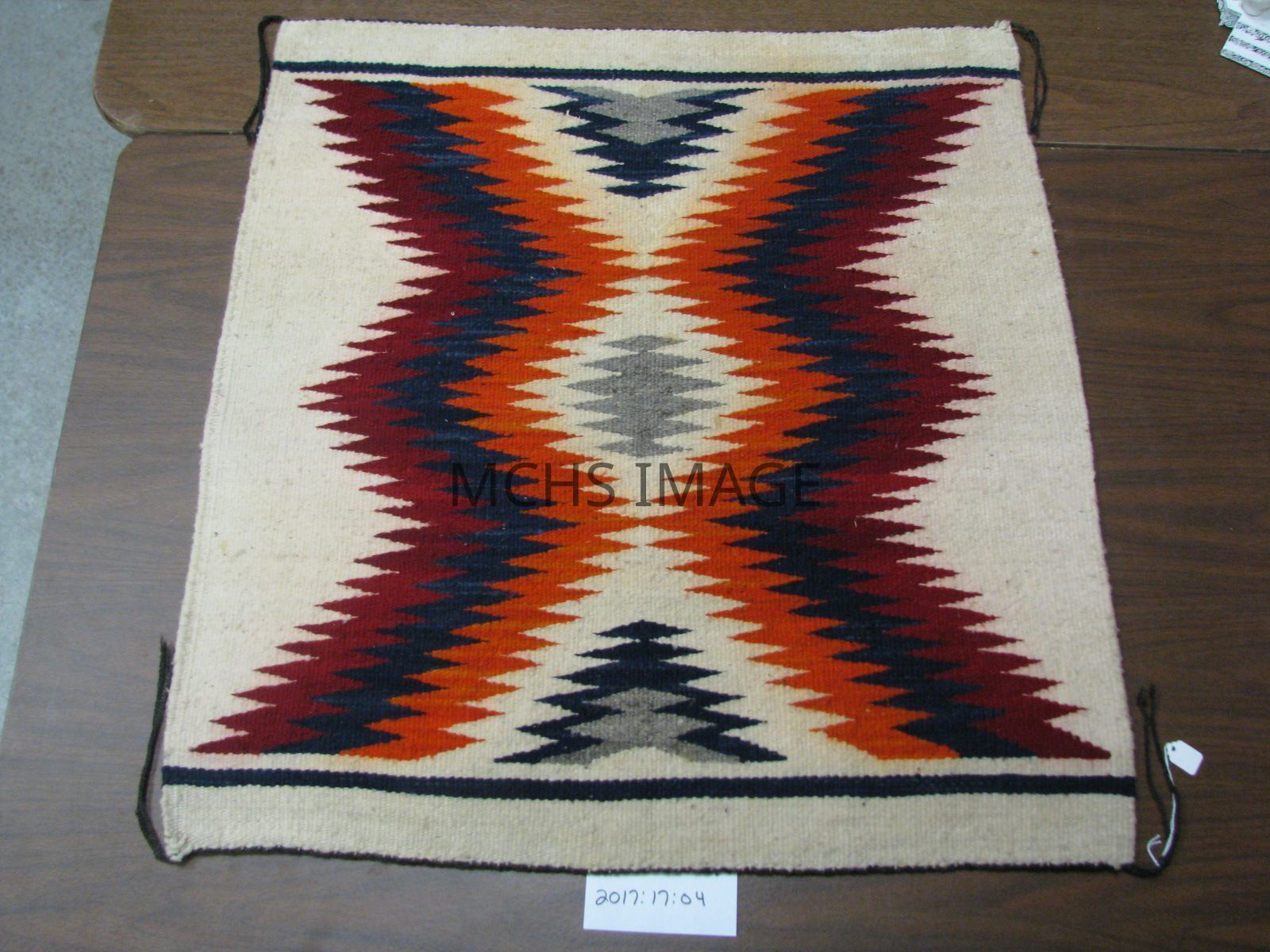 30" x 28" Native American red, black, orange, gray, & tan woven small saddle blanket. Possible Navajo Tribe.Collection
