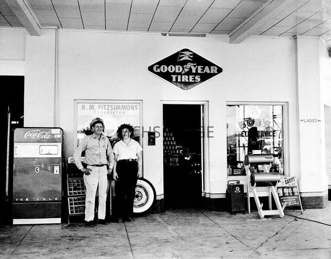 R.M. Fitzsimmons and a woman are standing in front. Goodyear tires are advertised. A Coca-Cola machine is on the left along with boxes for empty bottles.Collection