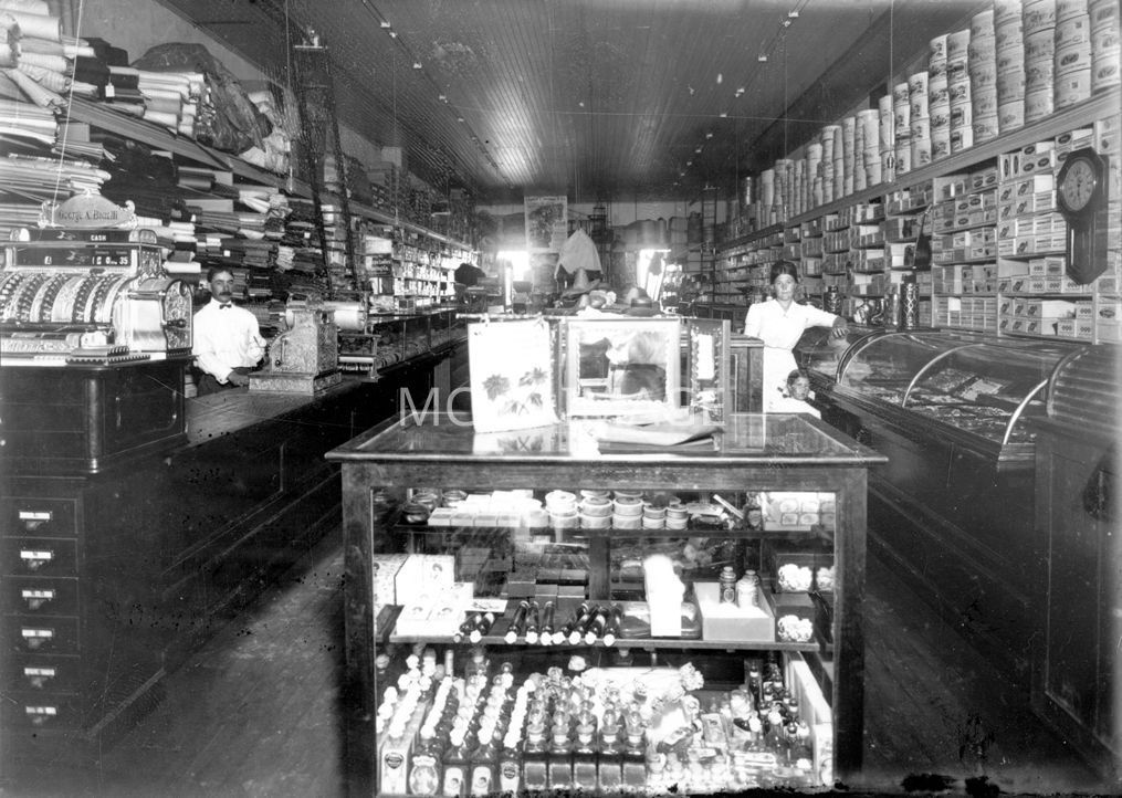 Inside the well stocked mercantile store. There is an assortment of boxes, bottles, a large cash register, and 2 clerks ready to help the patrons. West 4th street between Beale and Andy DevineCollection