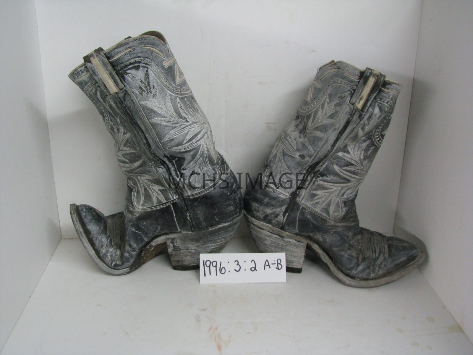 Pair of cowboy boots, black leather, white stitching and design, cattle brand Triangle Bar, is incorporated into the upper design on each boot, front and back. Owned by Leonard Neal.