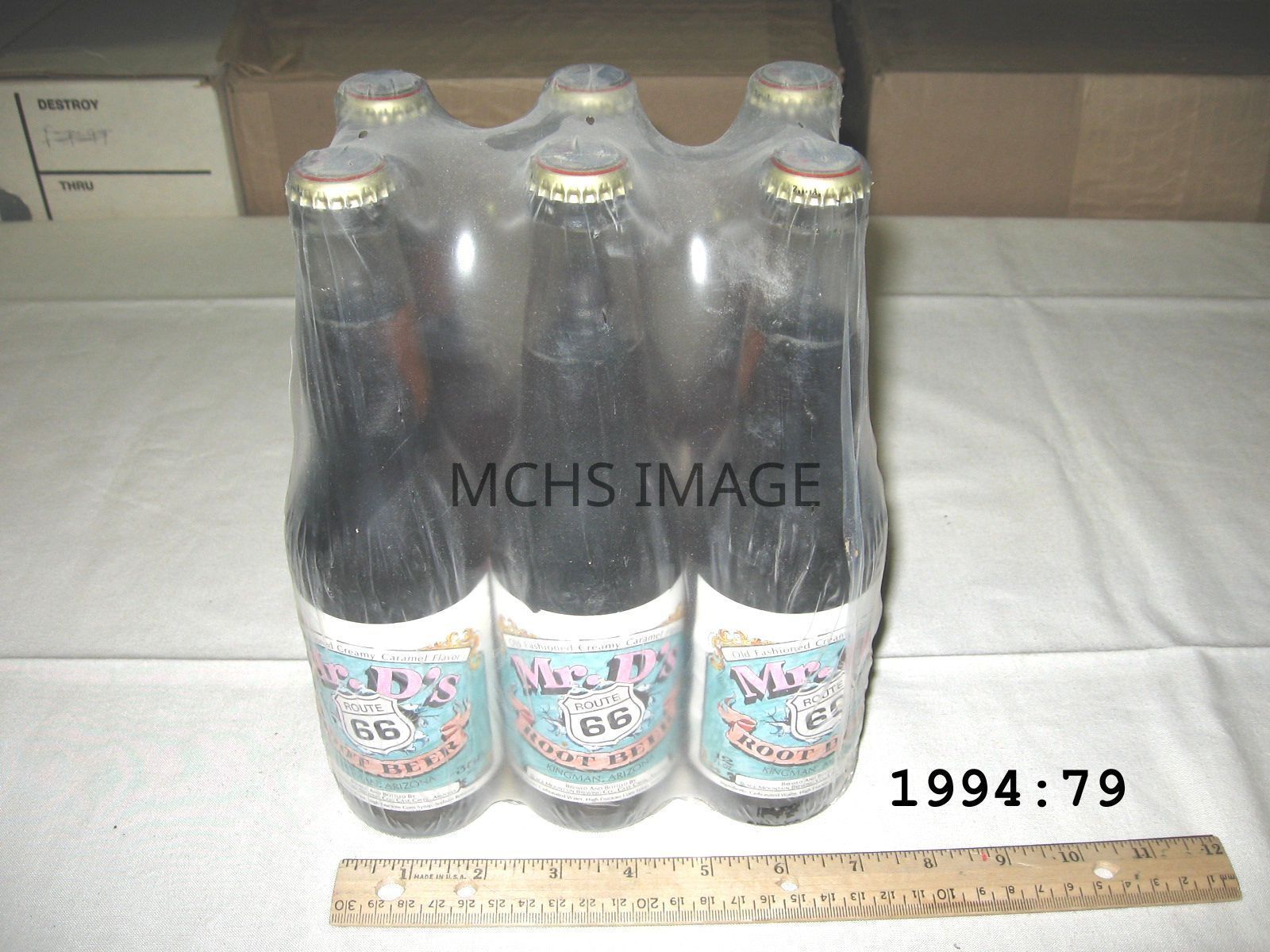 6 Root beer bottles 12 oz., plastic encased, made by Black Mountain Brewing Co., Cave Creek, AZ, glass, long necked bottles, metal crimped lids, labels: "Mr D's, Route 66, Root Beer". Bottled and labeled for the 1994 Route 66 Fun Run, four cases were produced before copyright infringement was discovered.