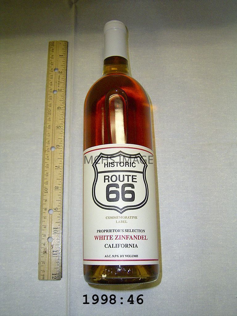 Bottle of white zinfandel wine with "Route 66" commemorative label. Wine made by Delicato Vineyards, 750 millilitres.
