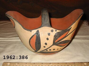 Indian bowl, overall length 10 3/8", width 6 - 1/4", base diam. 3 - 1/4". Flared edge with bail handle, floral pattern polychrome. Maricopa Indian.