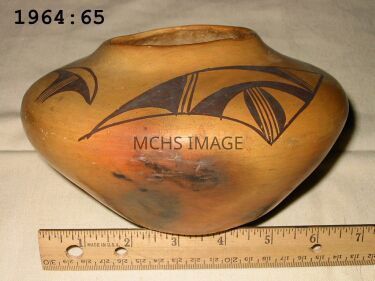 Native american bowl, approximate dimensions: 7" in diameter, with a 2 - 3/4" opening, a height of 4 - 1/4" and a flattened 2 - 1/2" base. Painted a cream color with four brown painted designs on the upper flats of the sides. Discolored by fire on a number of areas.