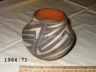 Native American clay pot (bowl), Acoma tribe. Approximately 2 - 3/4" diameter at the mouth, 4 - 7/8" overall diameter, 4 - 1/4" high with 2" base diameter. Inside painted reddish tan and cream-white. Outside painted grey-brown and white design surface over reddish tan base. Indented bottom.