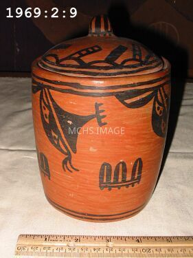 Bowl is 5 -1/4" to lid, 5 - 3/4" across, in excellent condition, is red clay black design, Maricopa Indian made.