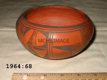 Native American clay bowl. 5 - 3/8" overall diameter, 1 -1/2" base diameter, 2 - 7/8" high and 4" across the mouth. Painted a light reddish brown and designed with dark brown figures on the mid-section. The mouth rim has three rings of brown, two narrow and one wide.