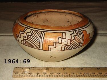Native American clay bowl, Acoma Tribe, Approximately 5" overall diameter. 3 - 1/2" diameter across mouth, 1 - 5/8" bottom diameter. And 1 - 3/4" high. Unpainted inside. Exterior painted greyish-white with a dark brown and orange/tan geometric deisgn on 1" of the upper shoulder of the outer sides.