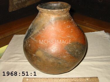 Bowl is 11" high, 10" wide, 5" across lip, in excellent condition. Description: brown-red clay, wash marks forming dominating patterns. Hualapai Found in a cave along upper Colorado river in present Lake Mead as waters were rising behind Boulder Dam,