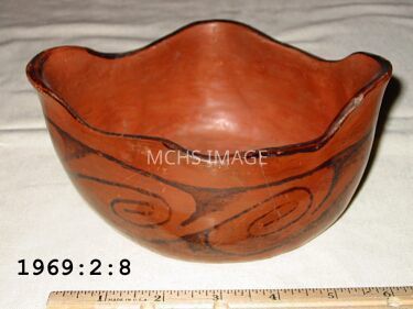 Bowl is 3" high, 5 - 3/4" wide, 7" long, made by Maricopa Indians. Made of red clay, black designs, cracked on both sides.