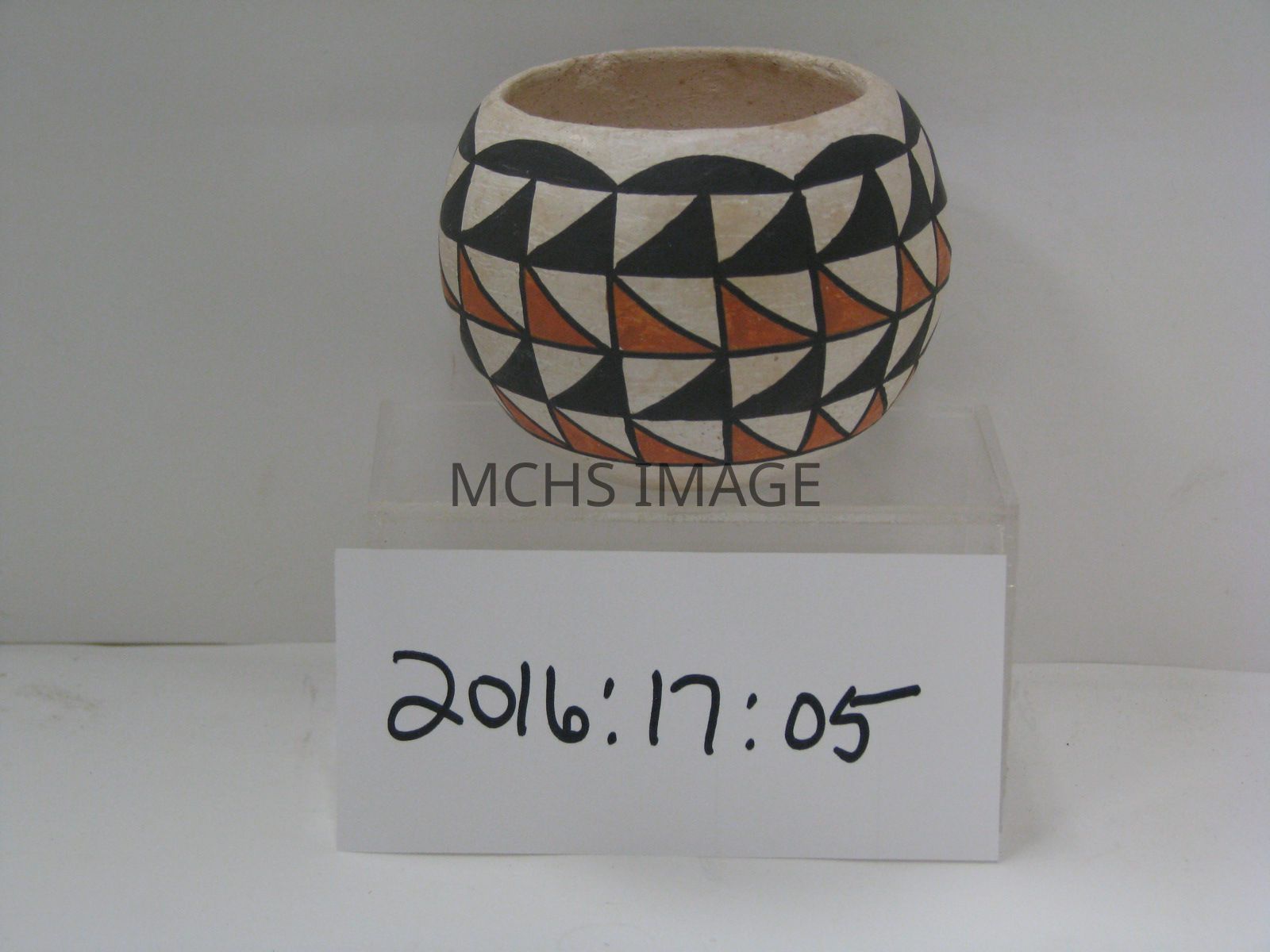 American pottery ceramic bowl, native american design, 3" diameter. On bottom "Acoma Sky City NM Vellma Vallo" (Item belonged to Duey & Gordon Buchanan)