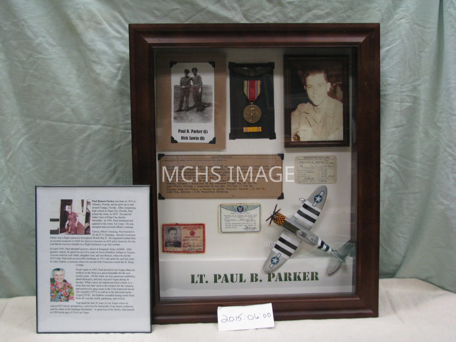19" x 23" Cherry wood shadow box honoring Paul B. Parker. Mr. Parker was a pilot of a P-51 Mustang. Throughout WWII he became a Flight Instructor. Shadow box consists of photo of Paul (on the left) and Dick (on the right), Photo of Paul (by himself), Paul's airplane and a medal he received during his time of service.