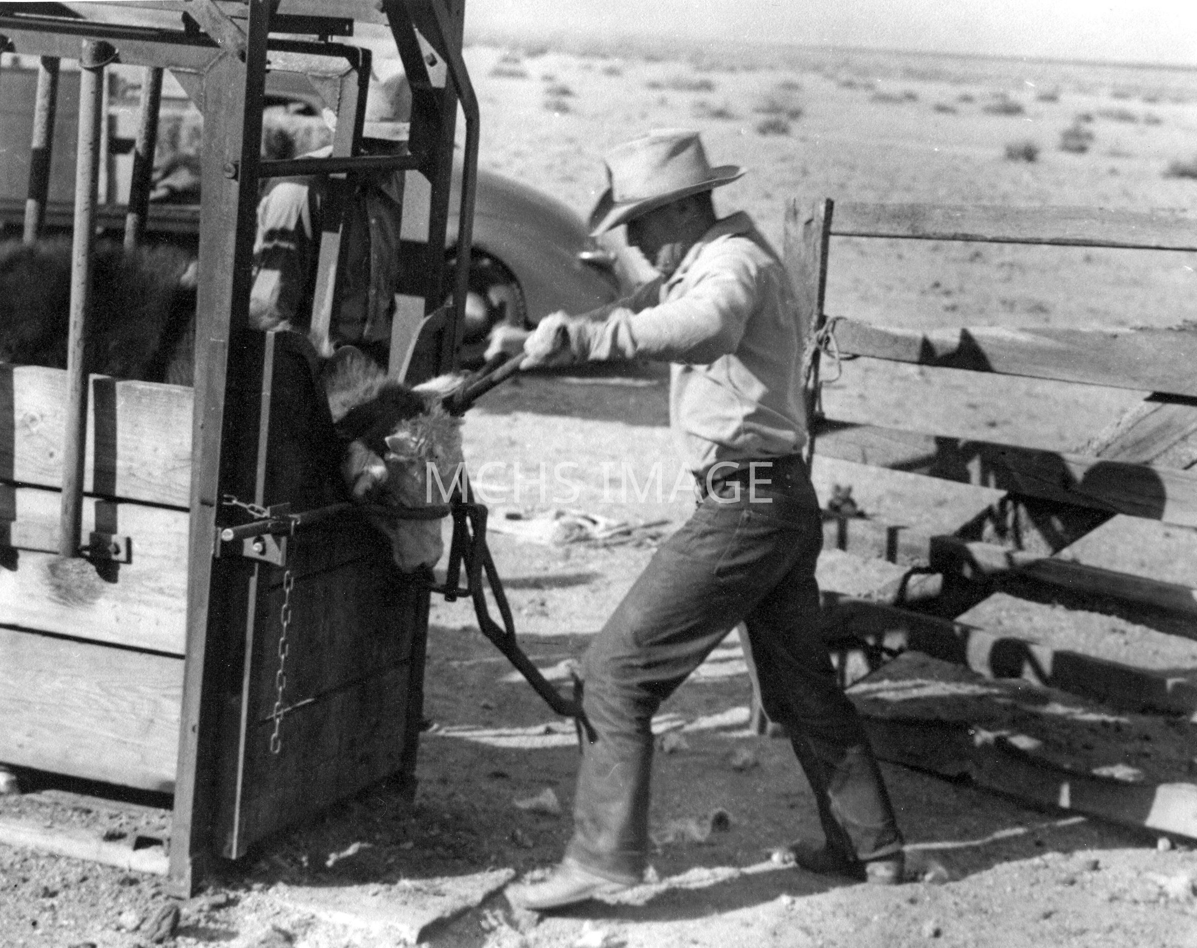 Howard Grounds a pioneer cattleman taking care of de-horning chore using a cattle squeeze chute.Other Names and Numbers