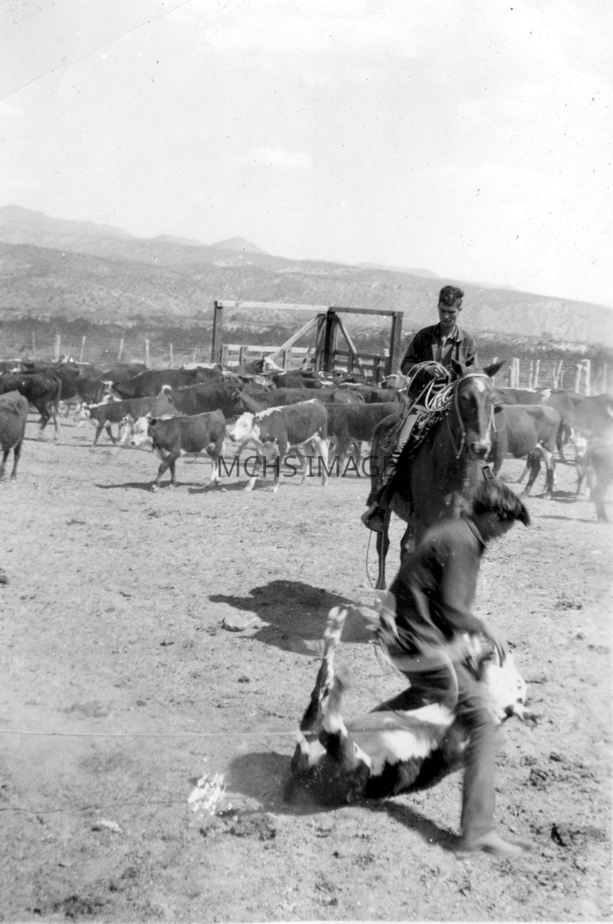 Two cowboys branding calves