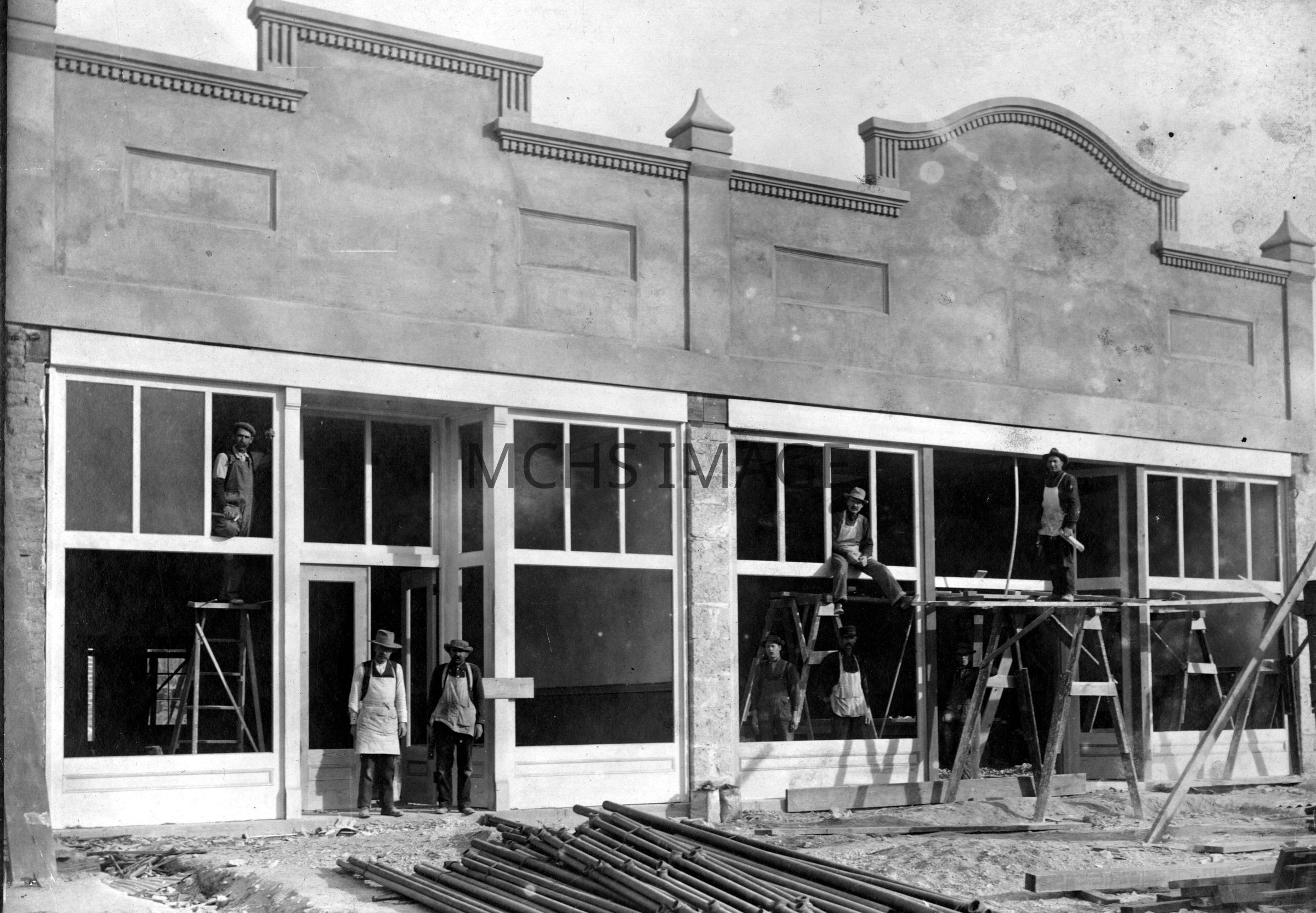 Carpenters and glass installers working on the facades of Front St. buildings. May be original construction or renovation. Built on east side of 4th St., facing south on Front St. (aka Andy Devine Ave.) Catalogue No: 307Collection