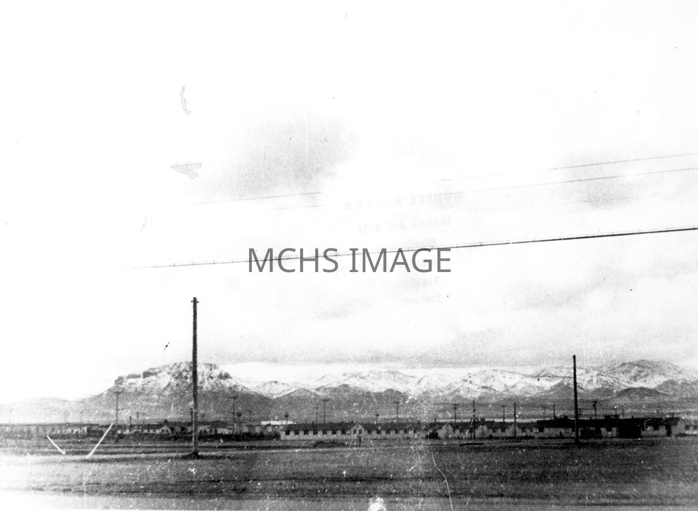 Photo showing buildings at Kingman Army Air Field in 1940's. Snow covered mountains in distance.Collection