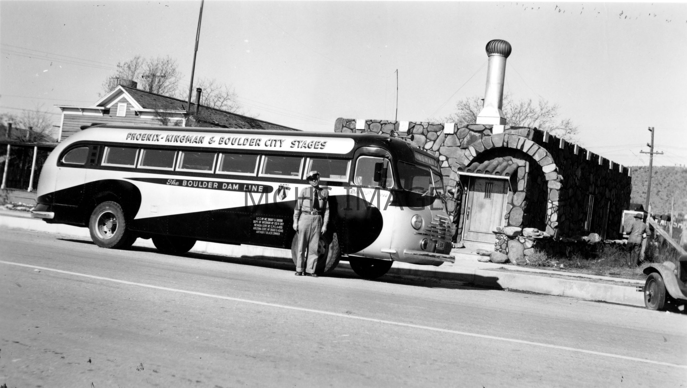 "Clipper" passenger bus in front of passenger depot - Beale Street. Arthur F. Black established the "Boulder Dam Stage Line" in Kingman, Arizona in 1920. Mr. Black came to Mohave County early and engaged in Mining and Milling. He married Mabel Van Marter,daughter of Mohave County pioneer, Charles Van Marter and had a large family. Arthur F. Black founded the Kingman Motor Company, owned and operated the Boulder Dam Freight Lines which later became Navajo Freight Lines. He also owned the Phoenix-Boulder City Stage Lines and was a president of the Mohave County Chamber of Commerce as well as Director of both the U.S. Highway 66 and Highway 93 Associations.Other Names and Numbers