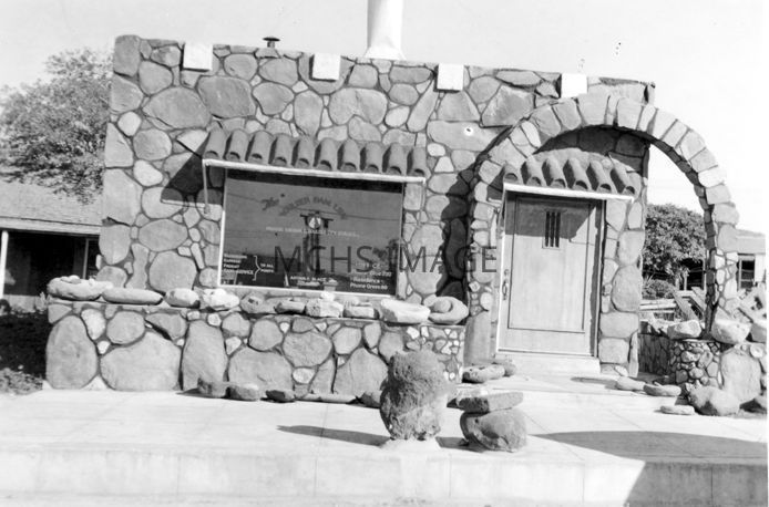 Depot on Front Street for Arthur Black, Boulder Dam Bus Line. This building was next door (west) of the Factory 2 You building. This littile rock building no longer exists.Collection