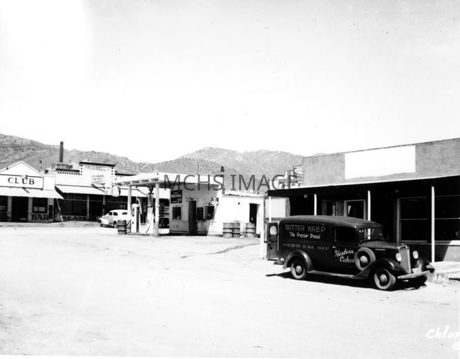 Business intersection of Tennessee Ave and 2nd Ave in Chloride AZ. Left to right: "Club" saloon; (Russels's Chloride Meat Market; Union 76 Service Station; Garage; Restaurant with Kingman Bake Shop delivery truck in front. Looking NEOther Names and Numbers