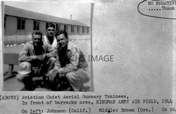 Aviation Cadet Aerial Gunnery Trainees 1944. Left to right; Johnson, Brown, Everett Cromer.Collection