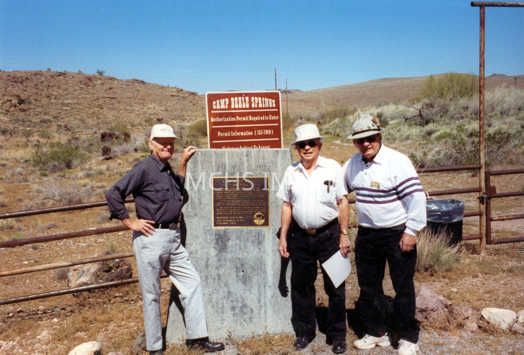Photo showing Ed Edwards (left), Loren Wilson, and Angelo Locicero standing by plaque at Beale SpringsOther Names and Numbers
