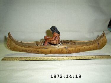 Birchbark canoe is 11 - 1/4" tip to tip, 2 -1/2" wide at center, male native american doll sitting in center of canoe, made by Mohawk Indians, Canada. Used in Kingman, Arizona.