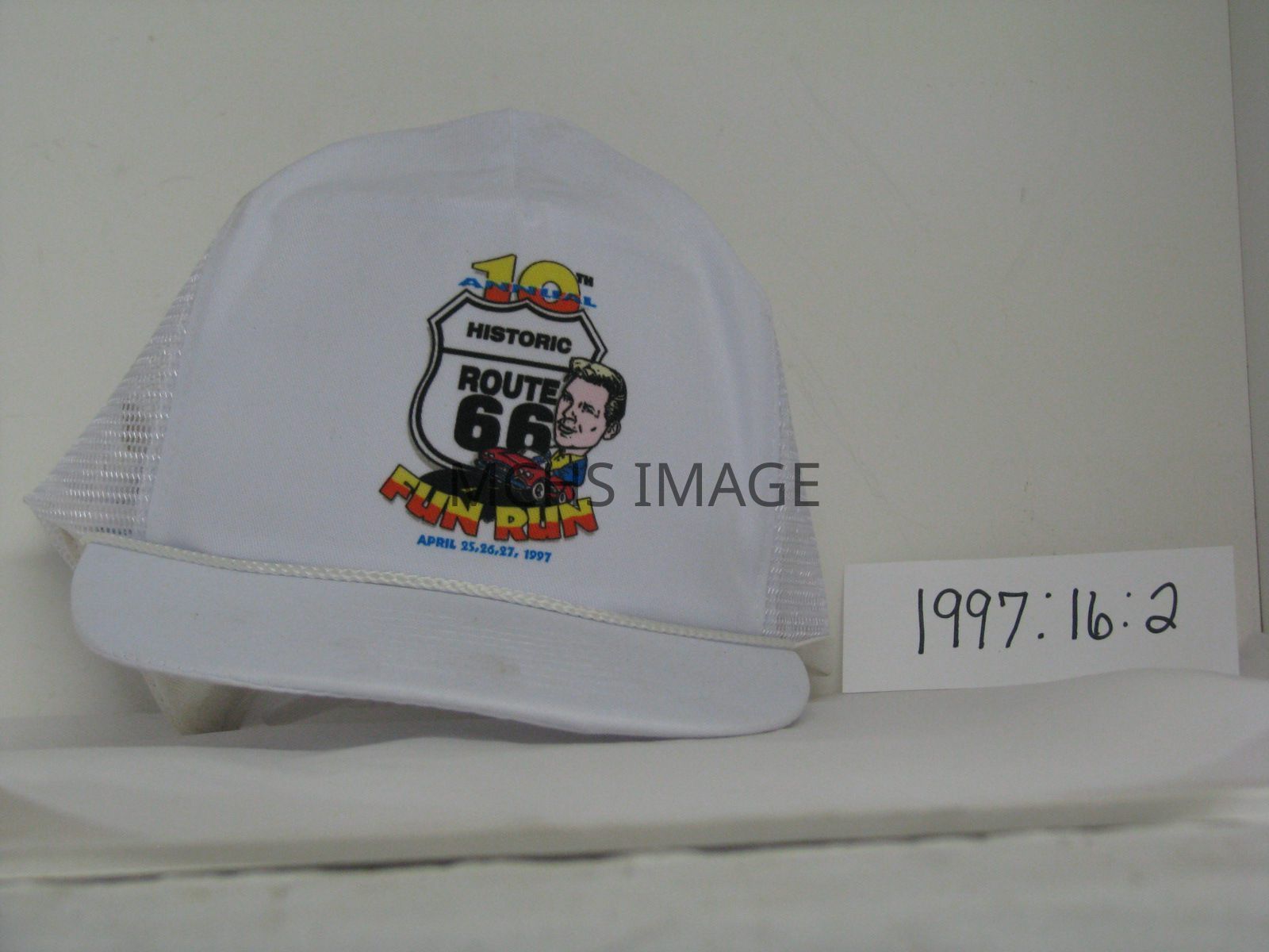 Souvenir baseball cap is white nylon and cotton, the logo on the front has the Route 66 shield with "10th annual and Fun Run, April 25, 26, 27, 1997" and a picture of Martin Milner. Used April 1997 in Seligman/Kingman.