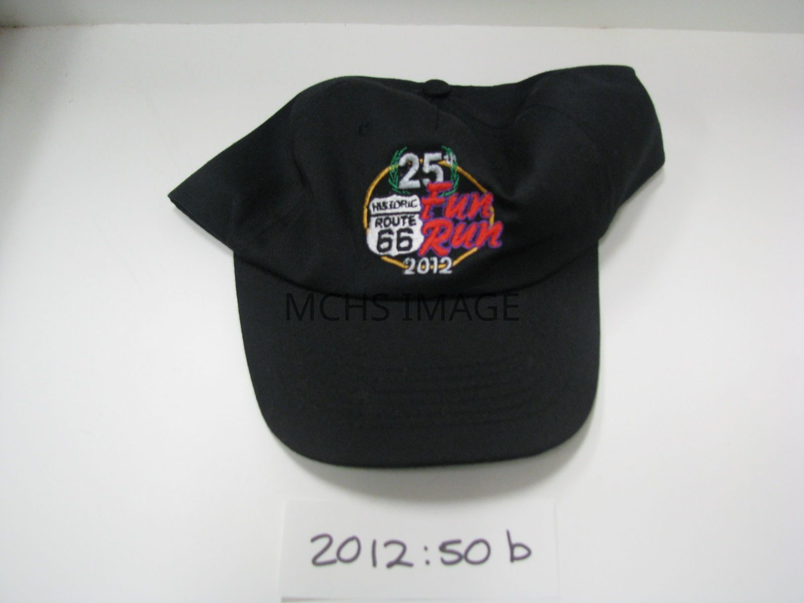 Black baseball cap commemorating 2012, Route 66 ( 25th Annual Fun Run ) logo above brim.