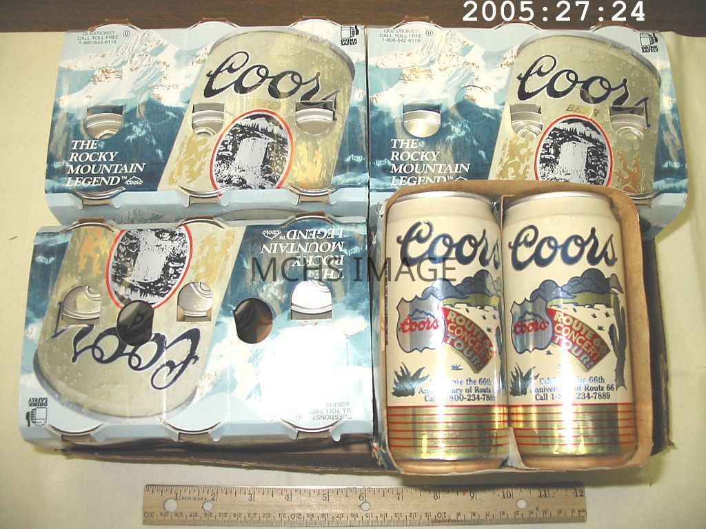 Case (24 cans, 4 six packs) of Coors beer. Each can printed with "Route 66 Concert Tour" and "Celebrate the 66th Anniversary of Route 66" 1961