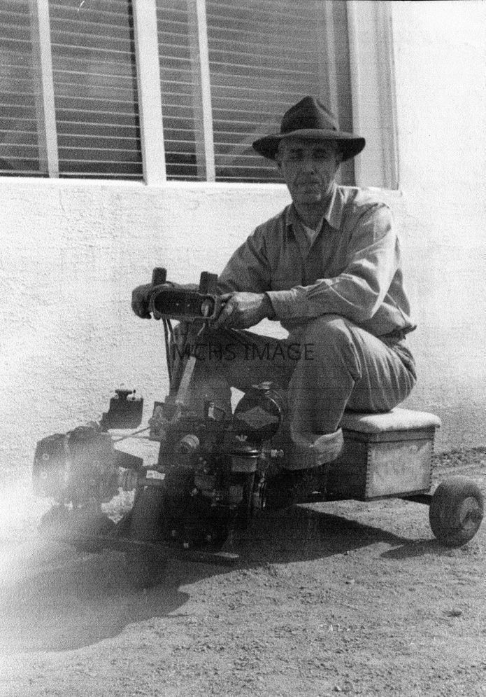 Cecil Davis on skooter made from airplane and military surplus parts, he rode skooter to and from work at Cecil's Shell Station at 6th and Front Street. One year he dressed as a miner on Dig N Doggie Rodeo Parade and another year as a cowboy when he wonCollection