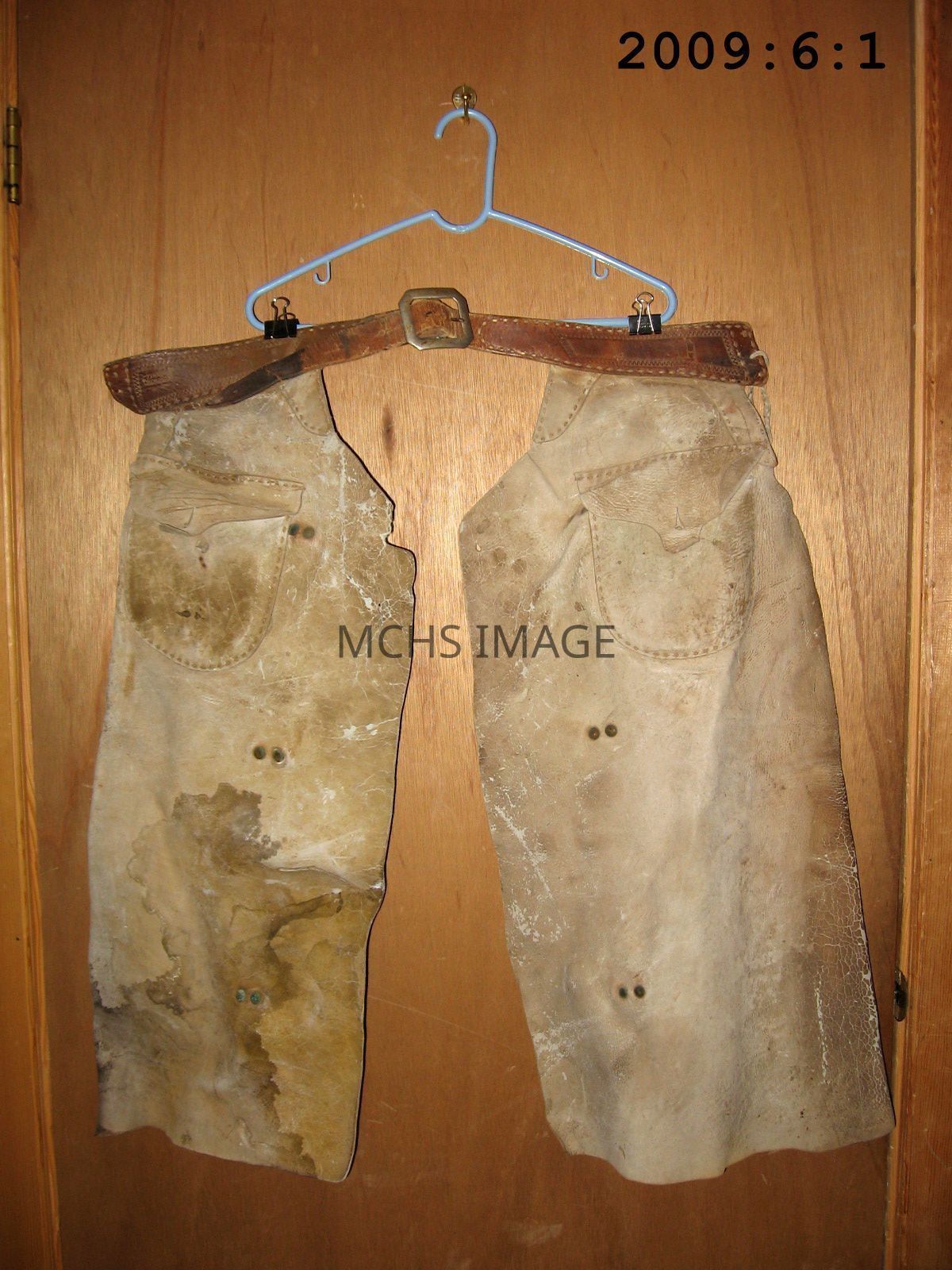 Set of Chaps, 33" long, in fair condition, very well worn and stained. A brand is craved into one side of the belt. (Not specified)