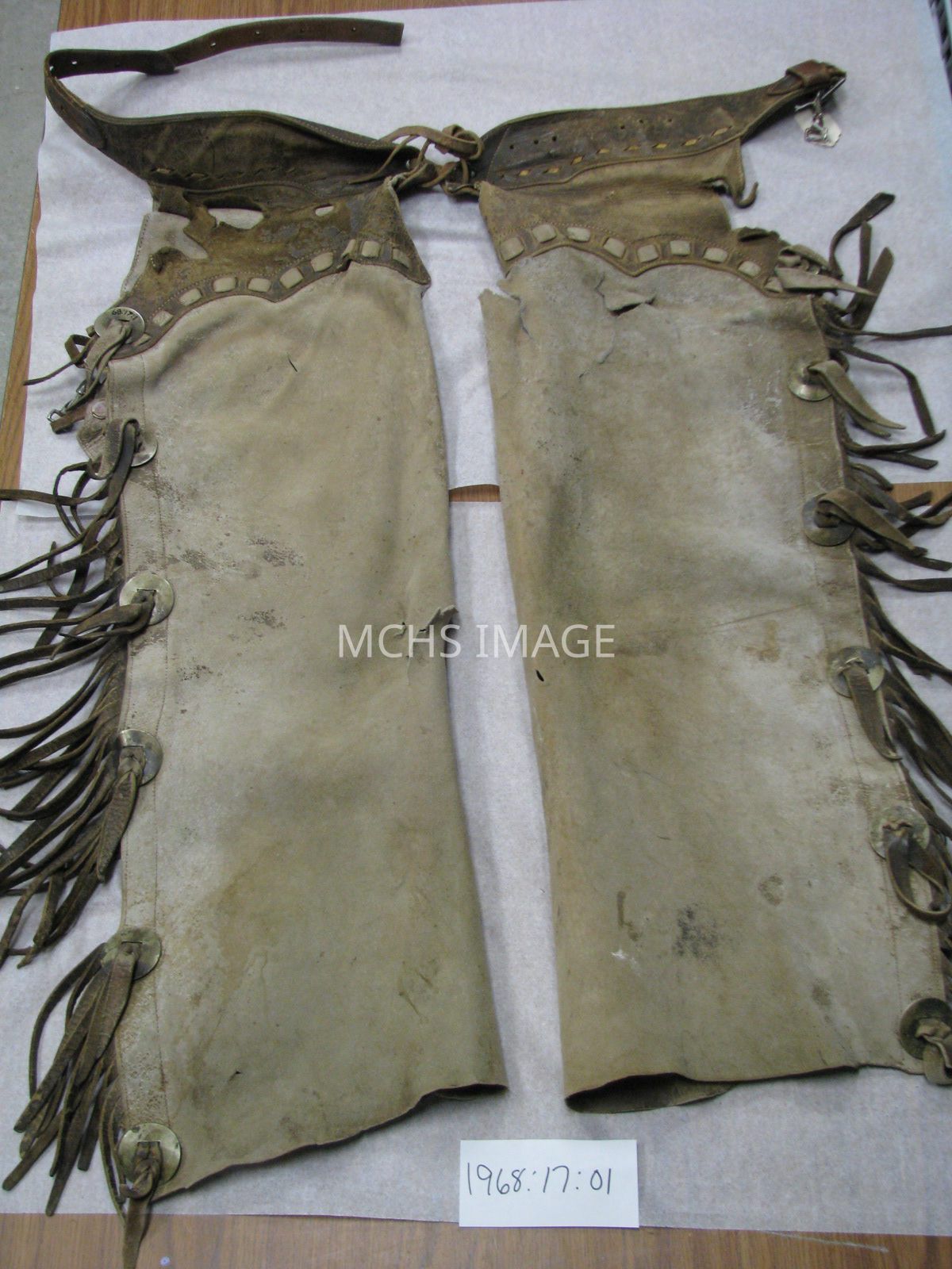 A pair of chaps, made of heavy leather, they are in fair condition with both chaps ripped in several places, and the leather is becoming brittle with light leather flaking. Used from 1906 - 1940's by William F. Grounds on WF Cattle Co. Ranch, Truxton Az.Collection