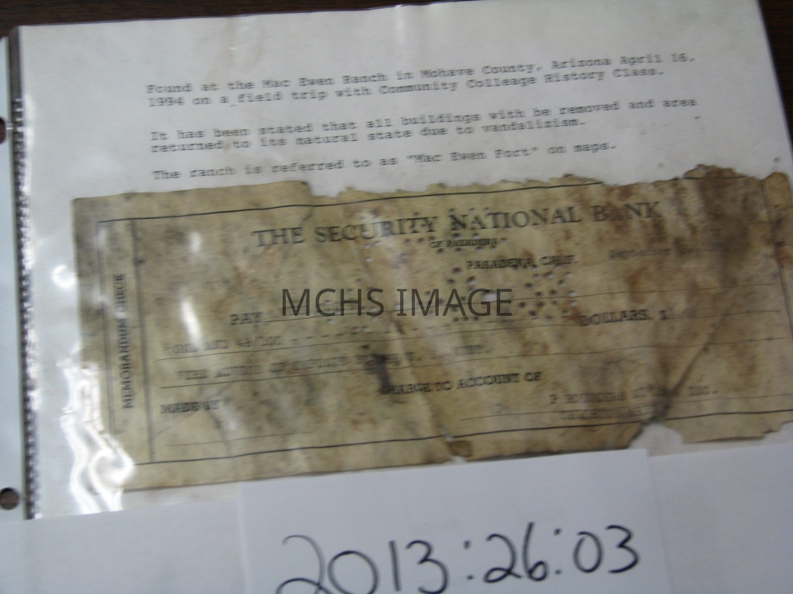 Certified check found at the MacEwen Ranch. Check dated September 2, 1933 from the Security National Bank made payable to Wire Cost in the amount of $1.48 issuer of check is Producers Mine Inc., Oatman, Arizona