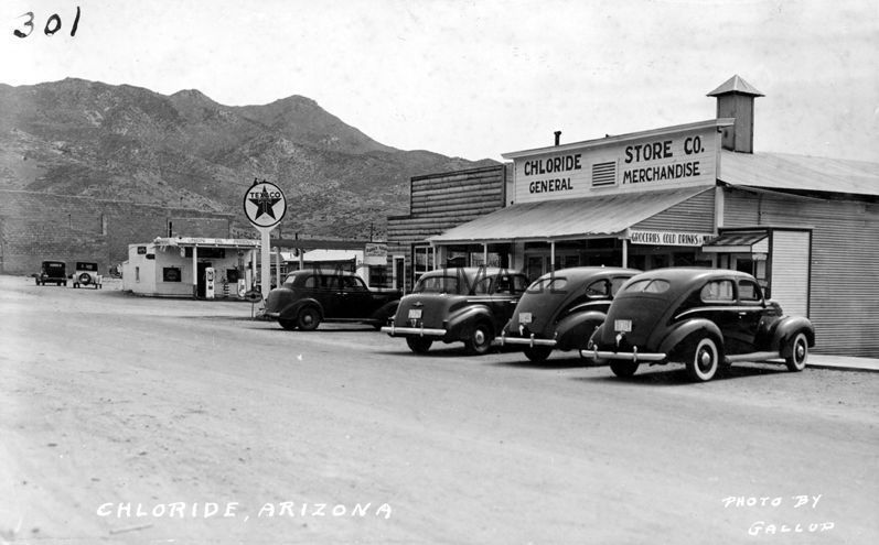 A street scene looking east up Tennessee Ave in Chloride . 1941 Fords.